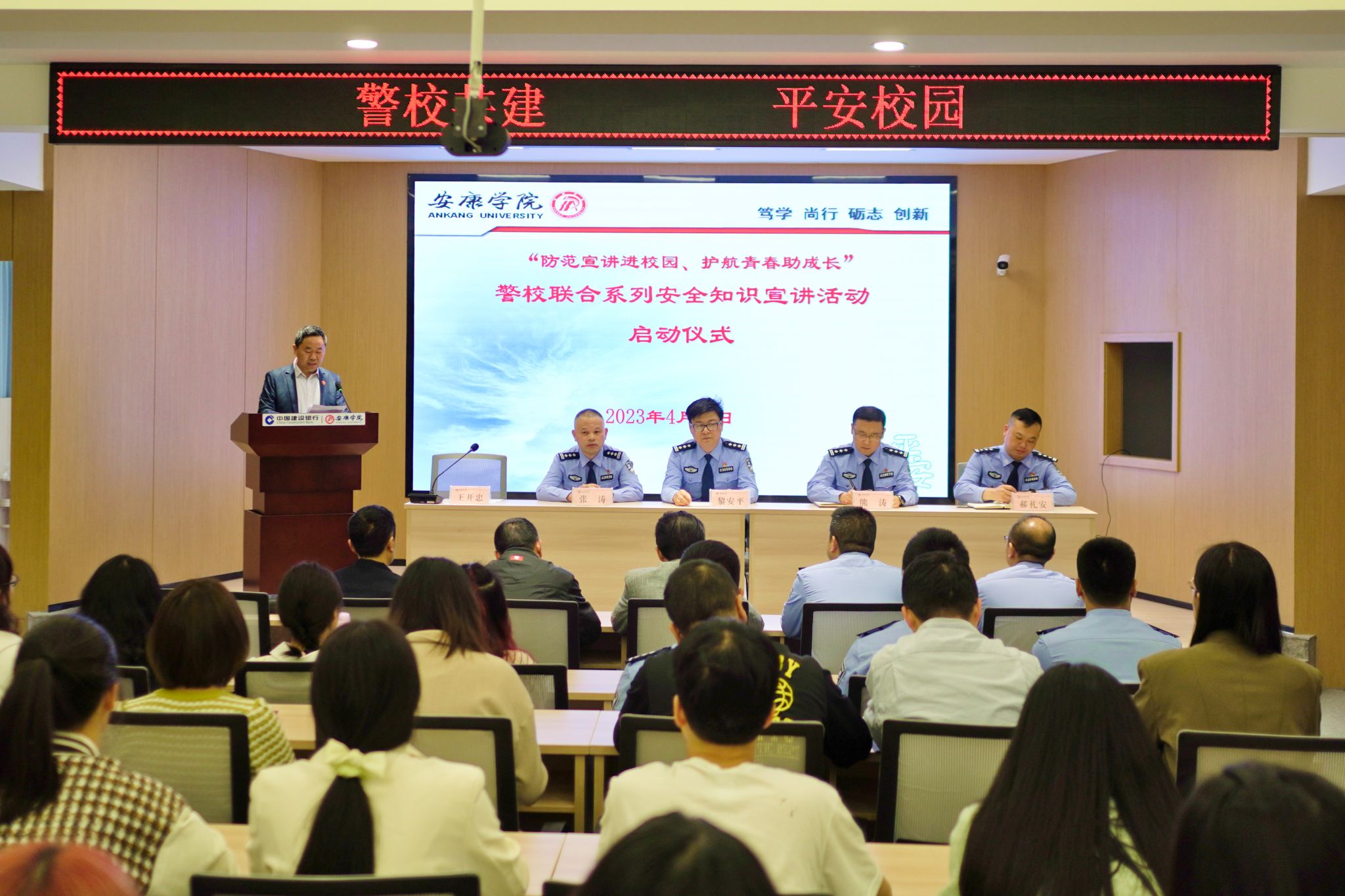 4月27日上午,安康市公安局、安康市公安局高新分局、安康市公安局汉滨分局,1066vip威尼斯“防范宣讲进校园、护航青春助成长”警校联合系列安全知识宣讲活动启动仪式在威尼斯官网乡村振兴学院多功能报告厅举行。