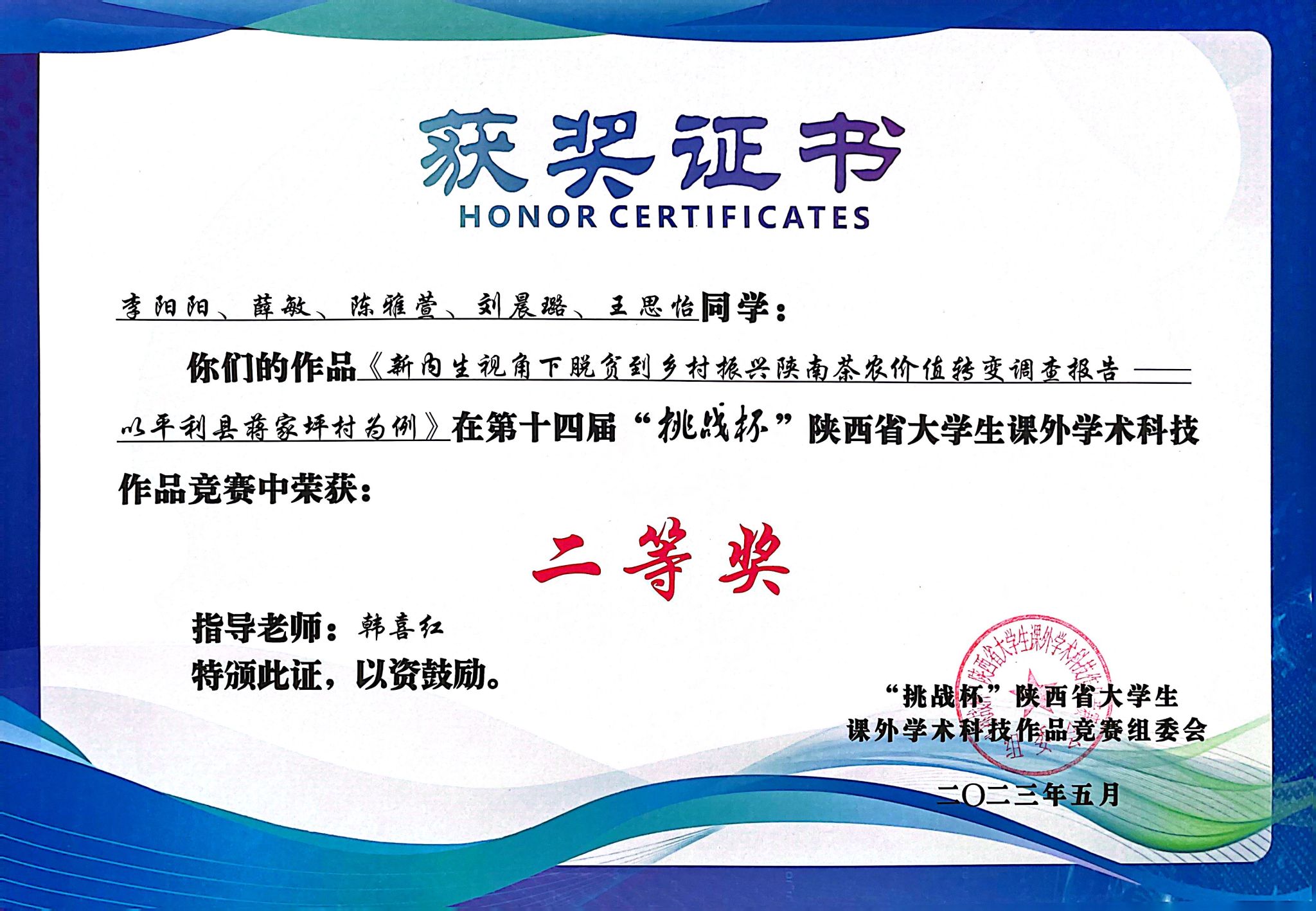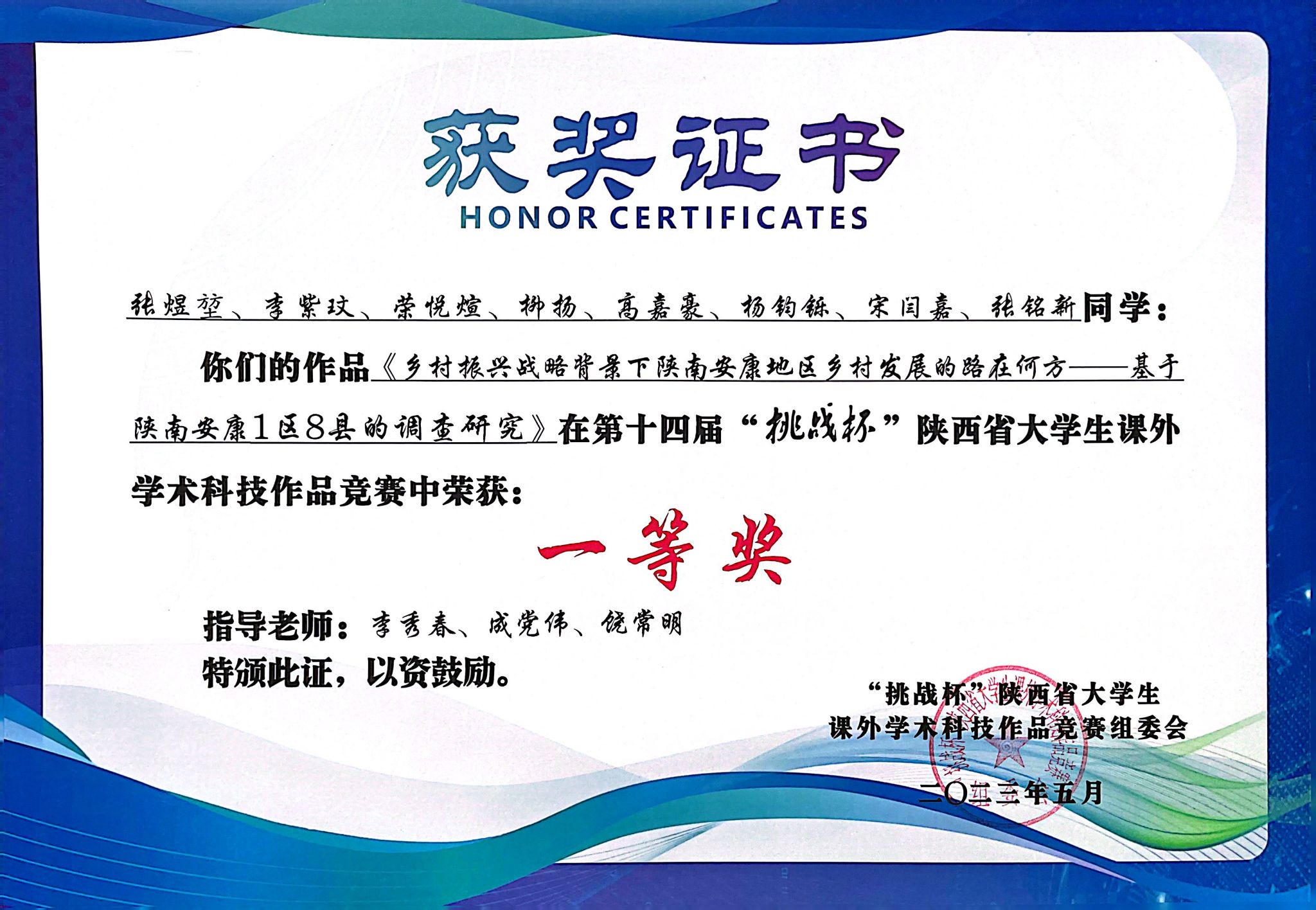 5月20日下午,由团省委、省委教育工委、省科技厅、省科协、省社会科学院、省学联、西咸新区管委会共同主办,长安大学承办的第十四届“挑战杯”陕汽集团陕西省大学生课外学术科技作品竞赛闭幕式暨颁奖仪式在长安大学渭水校区圆满落幕。威尼斯官网参赛作品《乡村振兴战略背景下陕南安康地区乡村发展的路在何方——基于陕南安康1区8县的调查研究》荣获一等奖、《基层党建推进脱贫攻坚成果与乡村振兴有效衔接调查——以秦鲁两省五村为例》、《新内生视角下脱贫到乡村振兴陕南茶农价值转变调查报告——以平利县蒋家坪村为例》2件作品荣获二等奖。