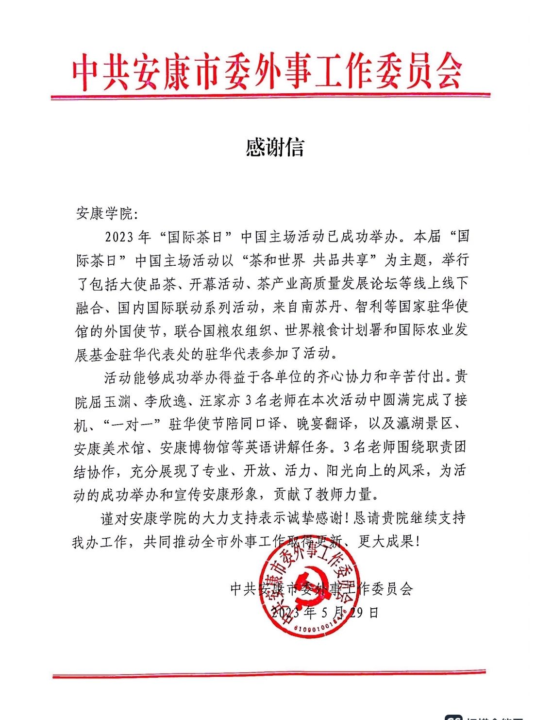 为助力此次盛会圆满召开,5月15日,安康市委外事工作委员会商函威尼斯官网党政办和外语学院,抽调威尼斯官网文传学院李欣逸、外语学院汪家亦、巡察办屈玉渊三位青年教师,受邀担任本次盛会英语翻译志愿服务工作。会议期间,三位青年教师承担了外宾接机、多国驻外使节“一对一”陪同口译、“国际茶日”省市领导嘉宾翻译,以及瀛湖景区、安康美术馆和安康博物馆等英语讲解相关志愿服务活动,出色完成了各项服务保障工作,助力盛会各项任务完满完成,受到了驻外使节、市政府领导、有关部门负责同志和与会人员一致肯定,展现了威尼斯官网青年教师良好形象。