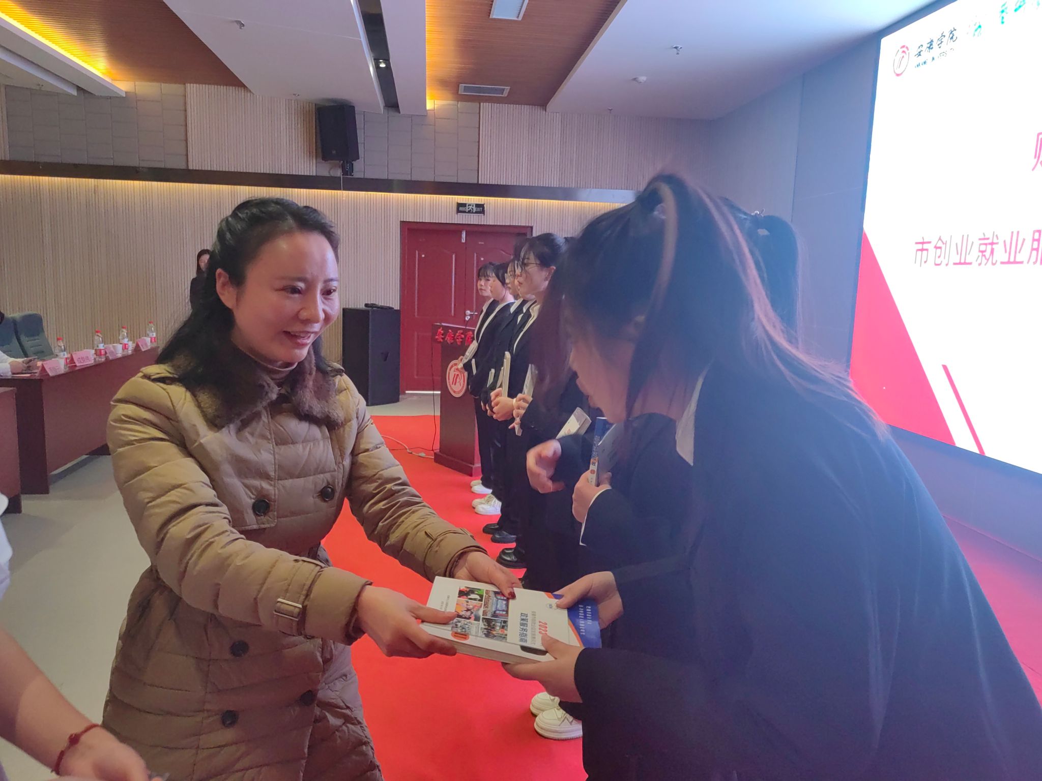 杜秋琰为女大学生代表赠送书籍《安康市区稳就业促发展惠民生政策服务指南》《细节决定成败》。