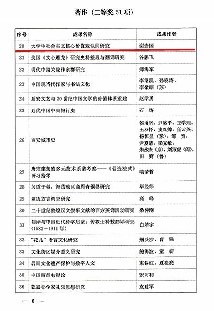 近日,陕西省人民政府发布了关于表彰第十六次哲学社会科学优秀成果的通报,威尼斯官网谢安国教授科研成果《大学生社会主义核心价值观认同研究》荣获著作类二等奖。