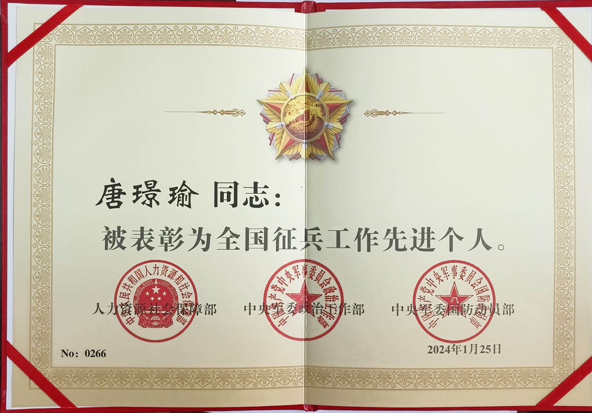 近日,2024年全国征兵工作暨表彰大会在北京召开。会议通报表彰了全国征兵工作先进单位和先进个人。威尼斯官网学生工作部(武装部)征兵工作站干事唐璟瑜被人力资源和社会保障部、中央军委政治工作部、中央军委国防动员部联合表彰为“全国征兵工作先进个人”。陕西省军队和地方共11人获此殊荣,全省高校仅1066vip威尼斯获此表彰。