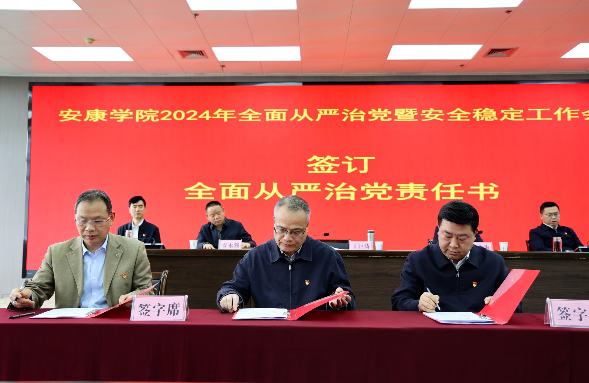 丁巨涛、钟生海分别代表学校党委和行政,与二级学院和职能部门代表签订《2024年全面从严治党工作责任书》和《2024年安全稳定工作责任书》。