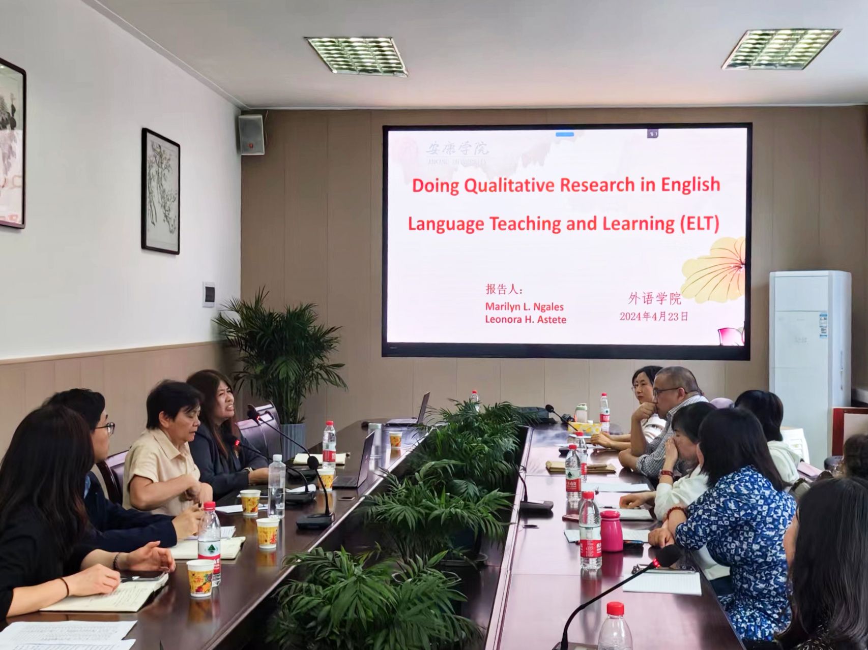 Leonora H. Astete博士以“外语教学中的定性研究”为主题,从定性研究的概念、理论基础、优点与主要特征、研究设计及案例分析等方面,系统进行了阐述,对外语教学中如何利用定性研究方法开展科学研究进行了全面指导。在交流环节中,Marilyn L. Ngales教授围绕外语教师在外语教学实践中的研究问题、研究对象、研究方法、研究有效性和科学性等方面所提出的疑惑进行了充分交流,解答了教师们的相关问题。