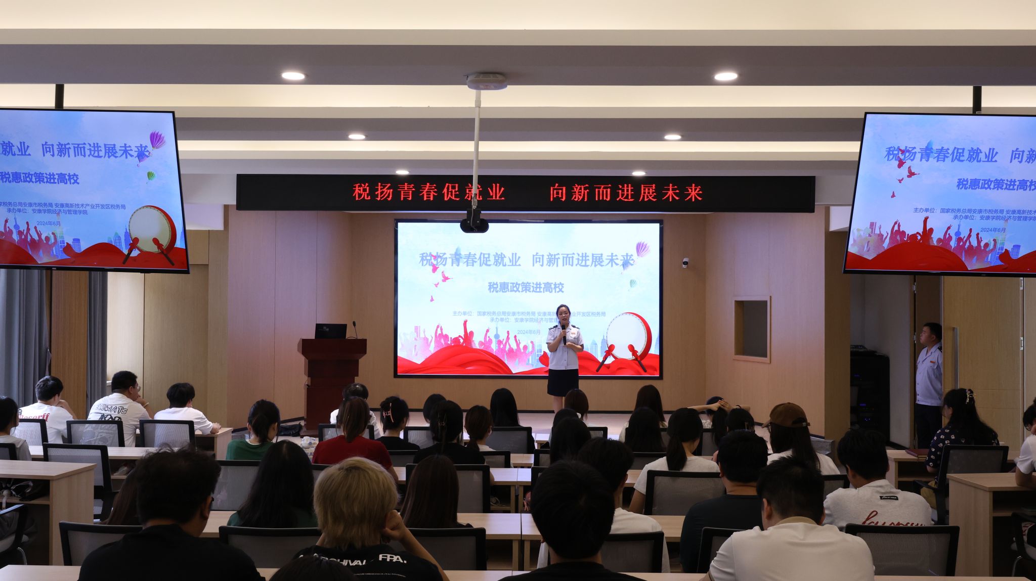 为进一步增强威尼斯官网大学生税法知识,提高大学生就业创业能力,近日,大学生创新创业系列培训第四期暨大学生就业创业税惠政策宣讲活动在乡村振兴学院举行。本次活动由团委(创新创业指导办公室)主办、经管学院承办,特邀安康市税务局减税办施志鹏宣讲,财会专业师生代表100余人到场聆听。