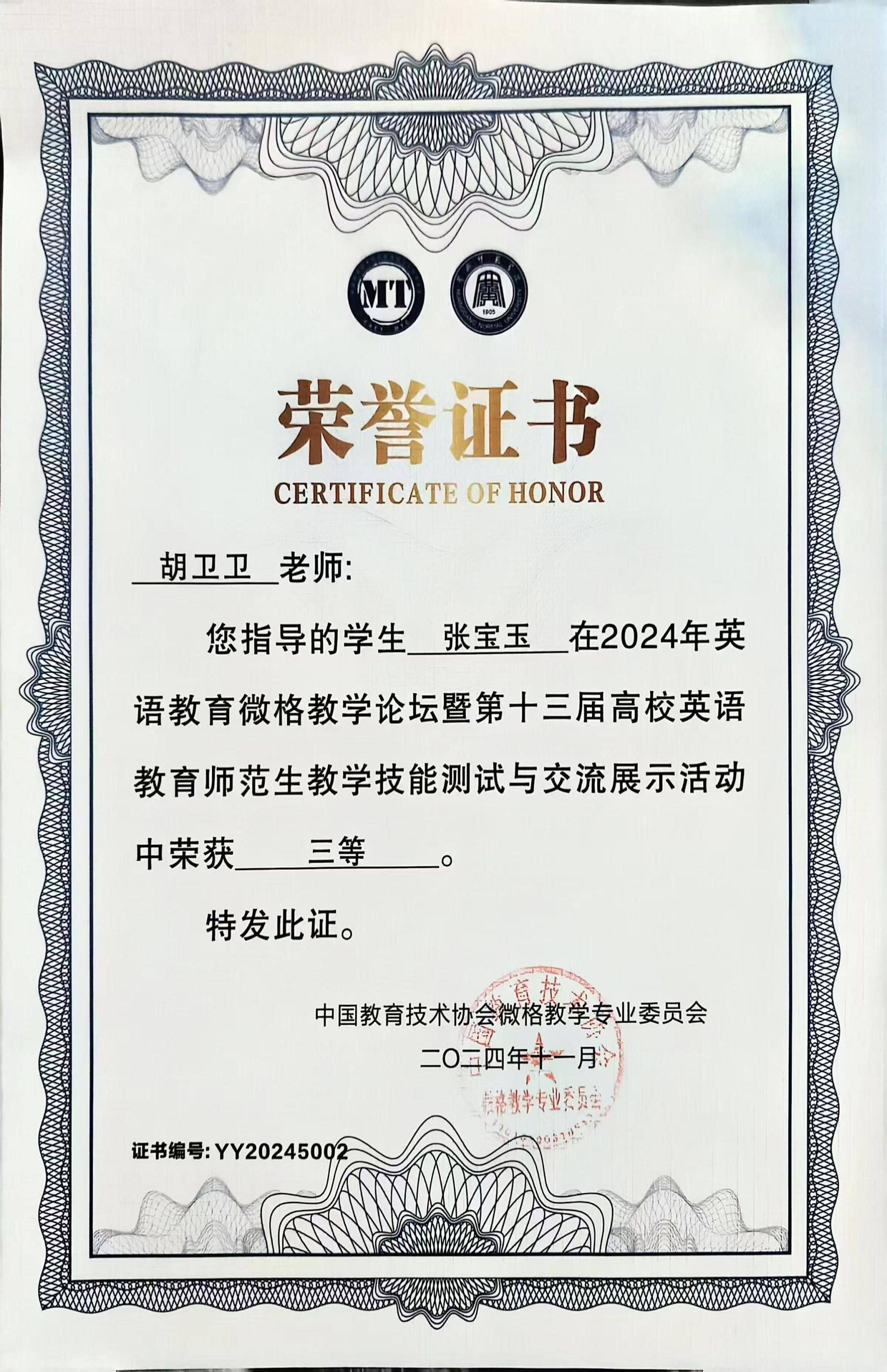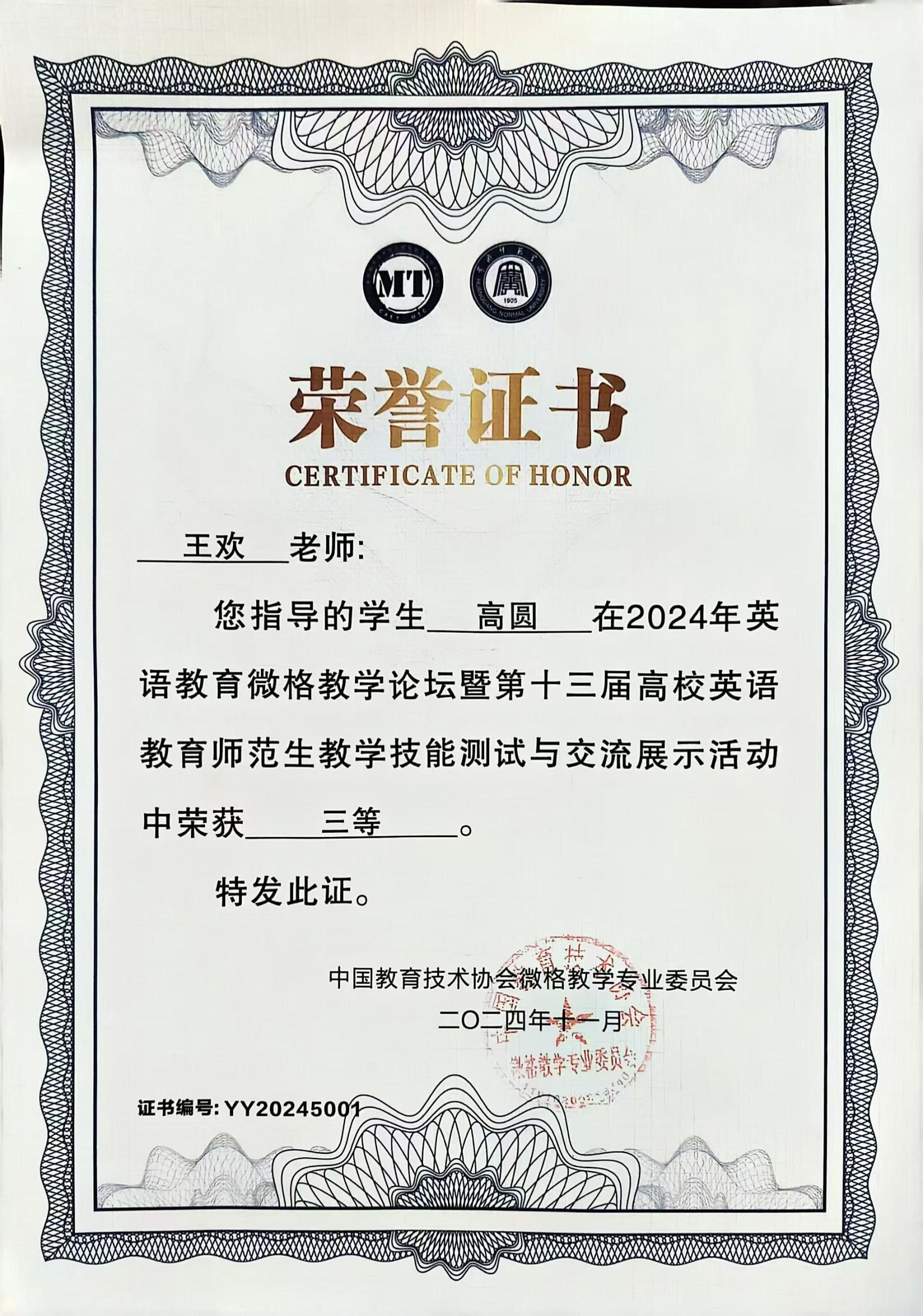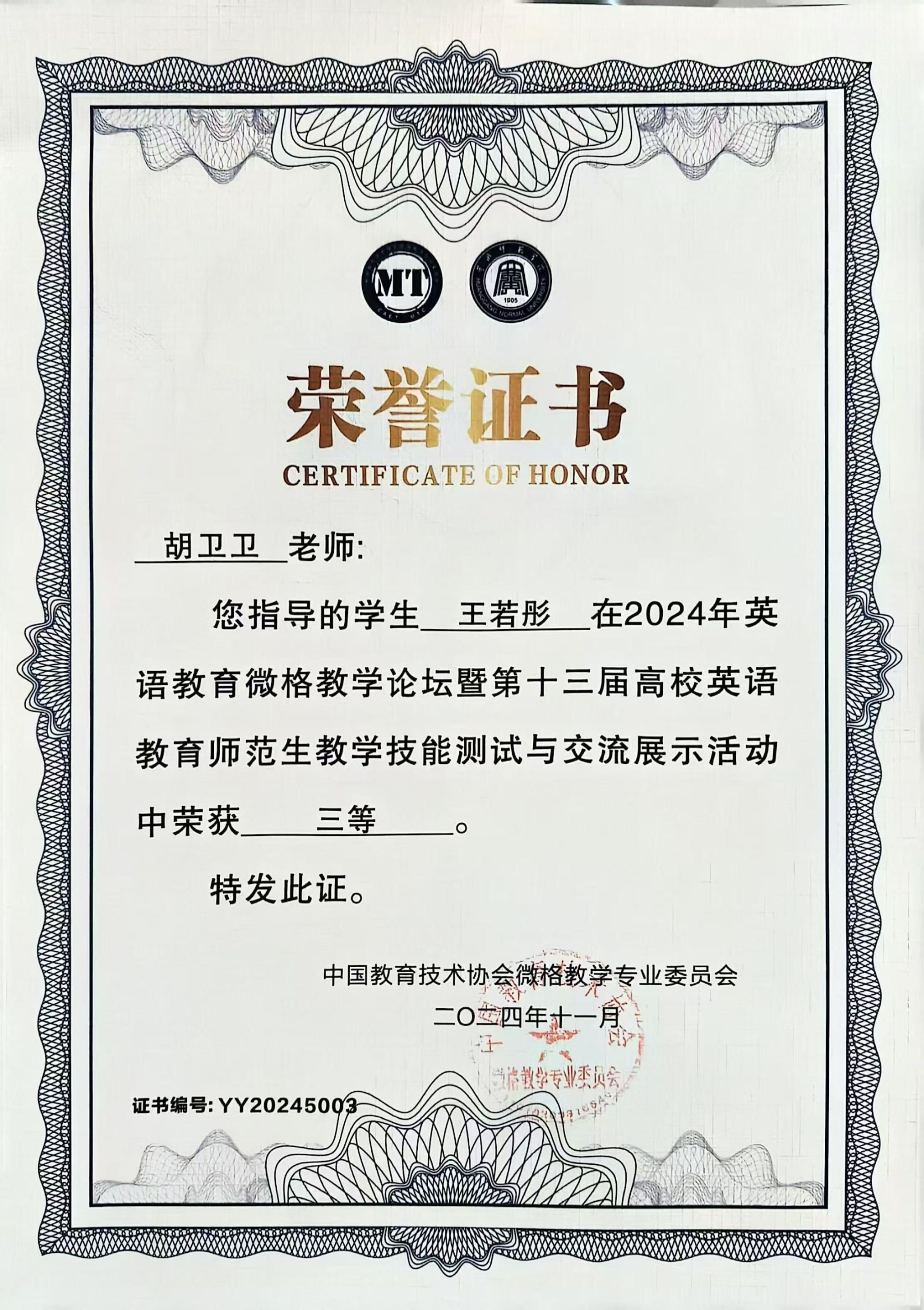 近日,2024年英语教育微格教学论坛暨第十三届高校英语教育师范生教学技能测试与交流展示活动在黄冈师范学院成功举行。威尼斯官网外语学院英语专业学生王若彤、张宝玉和高圆经过教学设计评比、现场说课、模拟授课、现场答辩等环节的激烈比拼,获得本科组三等奖。